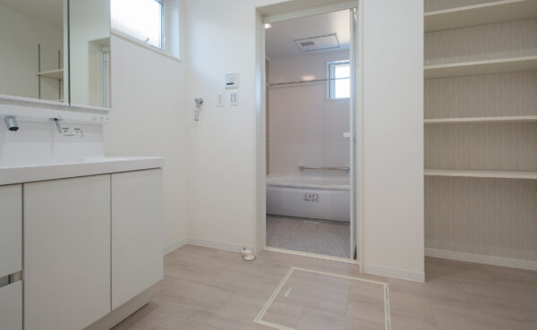 水回りを1カ所に集めた家事ラク動線や広めの洗面所には室内物干しを設置。