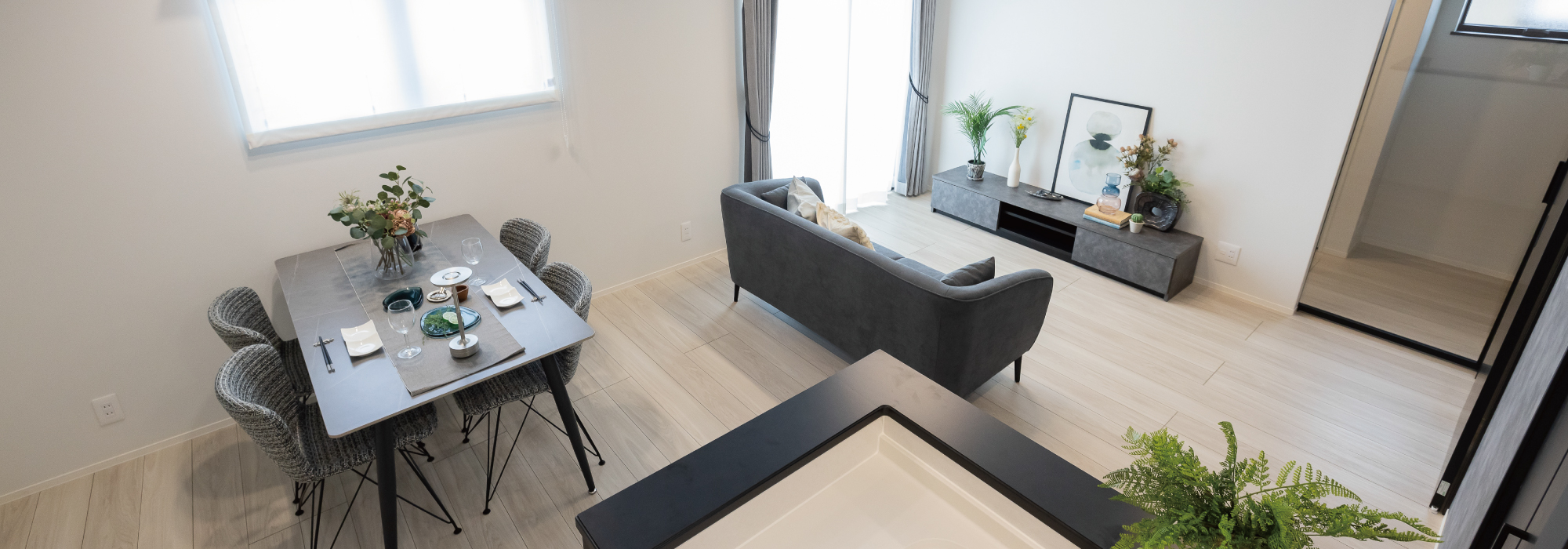 白×グレーのトーンがリビングをオシャレな空間に。南に面した明るいリビングです。