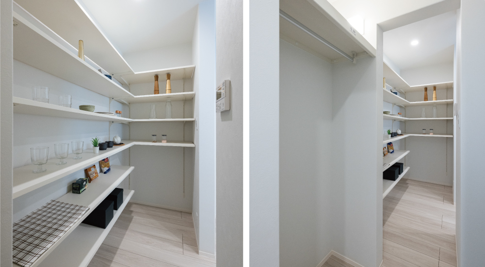 キッチン横のパントリーは、食品や日用品のストックにうれしい大容量収納です。