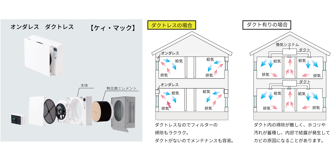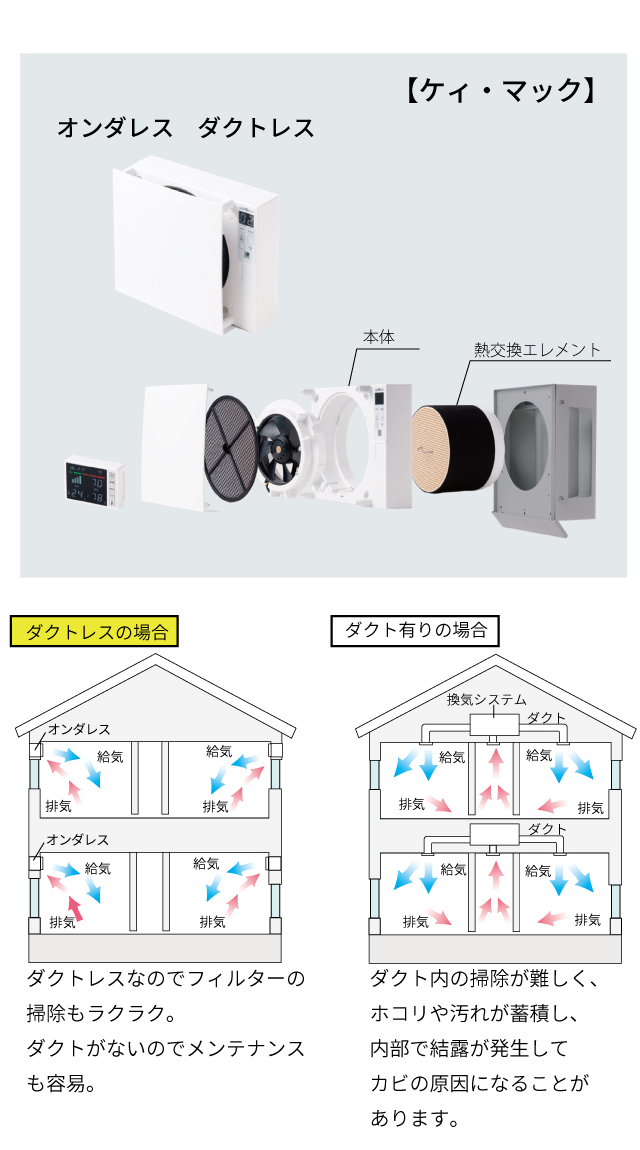 第1種換気システム(ダクトレス熱交換型)とは、給気と排気の両方を機械で行い、熱交換器で熱を回収・再利用することで、快適な室内環境を保ちながら換気できるシステムです。
