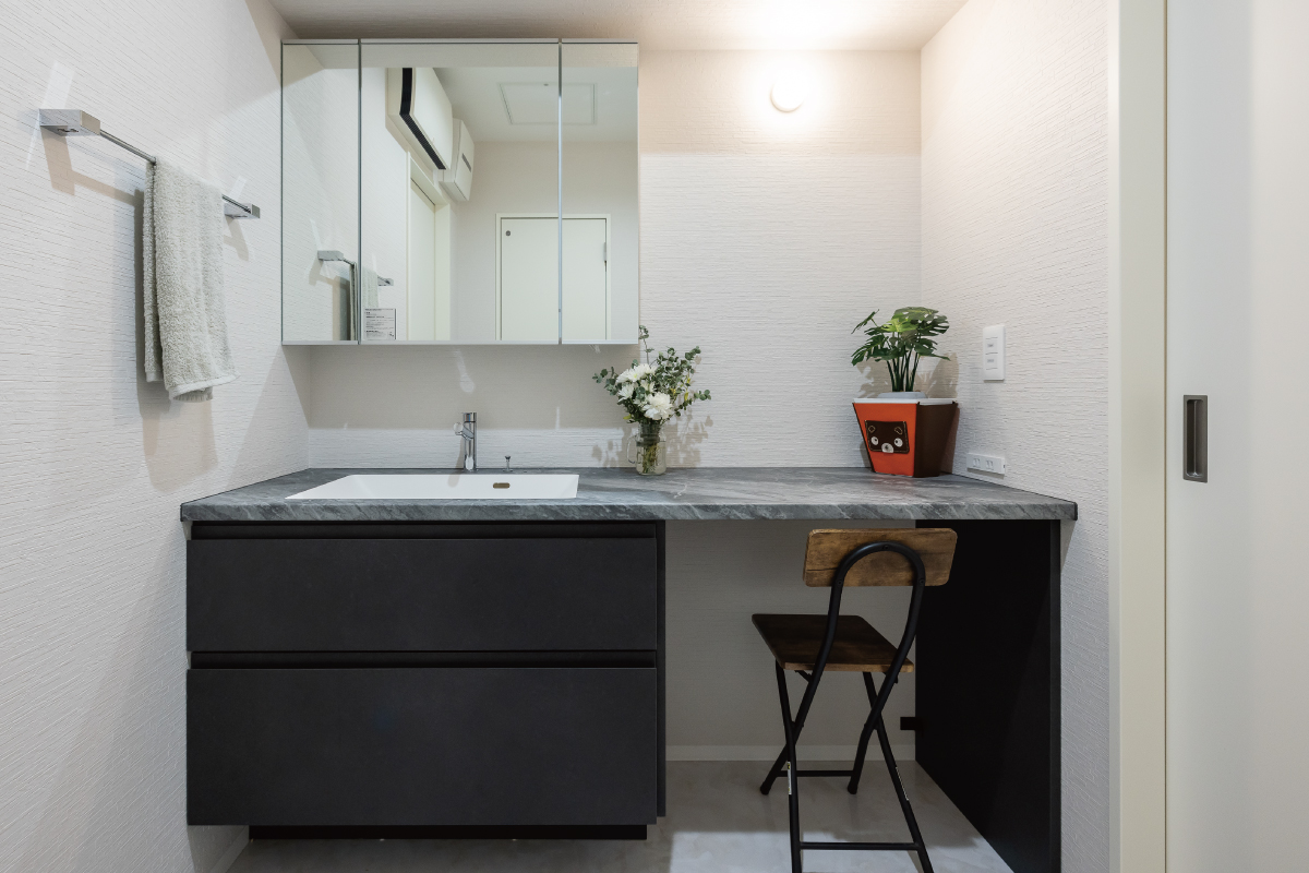洗面台の横にカウンターを設け、座ってゆったりと化粧や身支度ができる空間を確保。