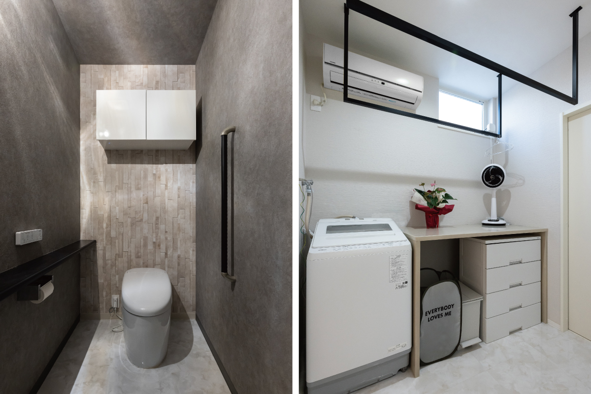 左)落ち着いたスタイリッシュな雰囲気を演出するグレー系の壁紙に、スッキリとした印象のタンクレストイレを採用。