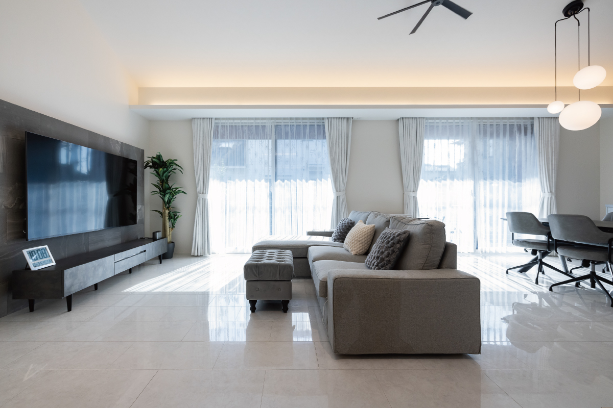 高級感漂う石目柄の床がLDKを華やかに彩り、床暖房が一年中快適な住まいを実現。