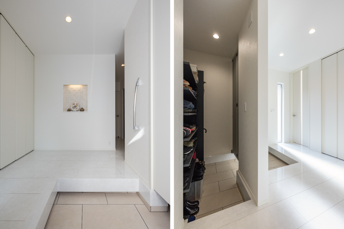 L字に広がる玄関はゆとりと開放感があり、シューズインクロゼットに直結しているため、靴やアウトドア用品をそのまま収納でき、玄関周りをすっきり保てます。