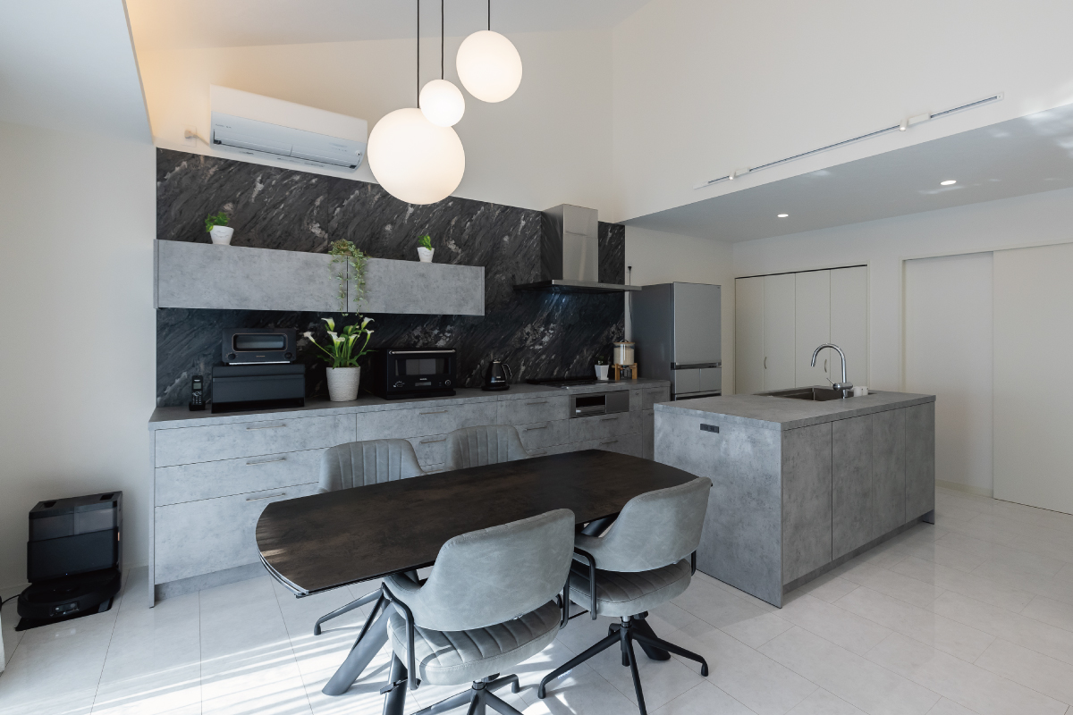 グレーの質感が映える、グラフテクトのスタイリッシュなダイニングキッチン。