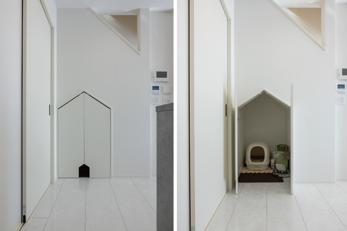 階段下のデッドスペースを“愛猫のハウス”に活用し、安心してくつろげる小さな居場所を作りました。