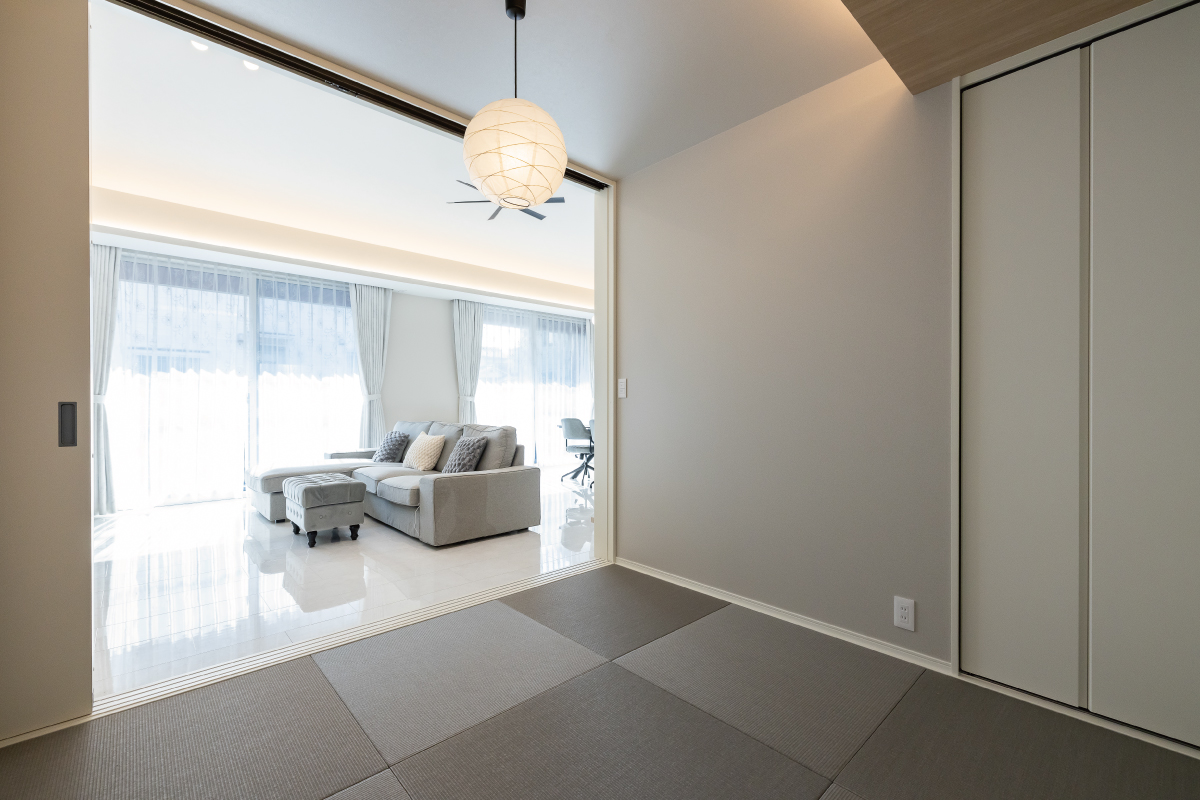リビングの隣に設けた畳スペースは、家族がくつろぐ傍らで猫もゆったりと過ごせる憩いの場所。