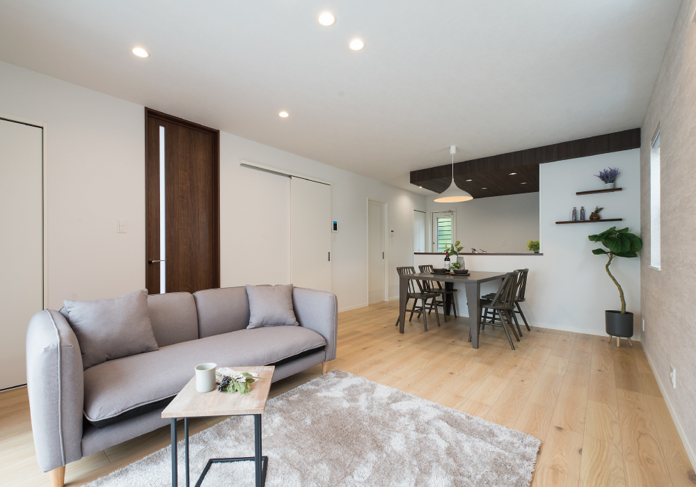 キッチンからダイニング、リビングまで見渡せる開放的な間取り。自然と家族が顔を合わせ、会話が生まれる設計です。