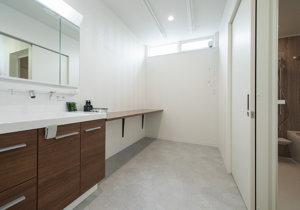 カウンター付きのランドリールームで洗濯物を「洗う→干す→畳む」までが完結!カウンター下は棚を置いて収納場所として活用できます。