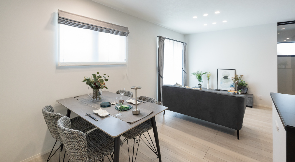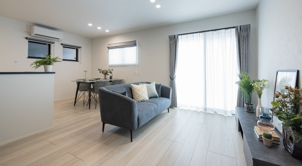 白×グレーのトーンがリビングをオシャレな空間に。南に面した明るいリビングです。