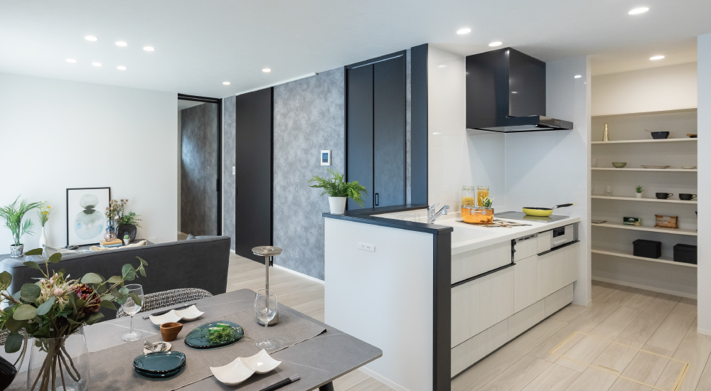 キッチン横のパントリーは、食品や日用品のストックにうれしい大容量収納です。
