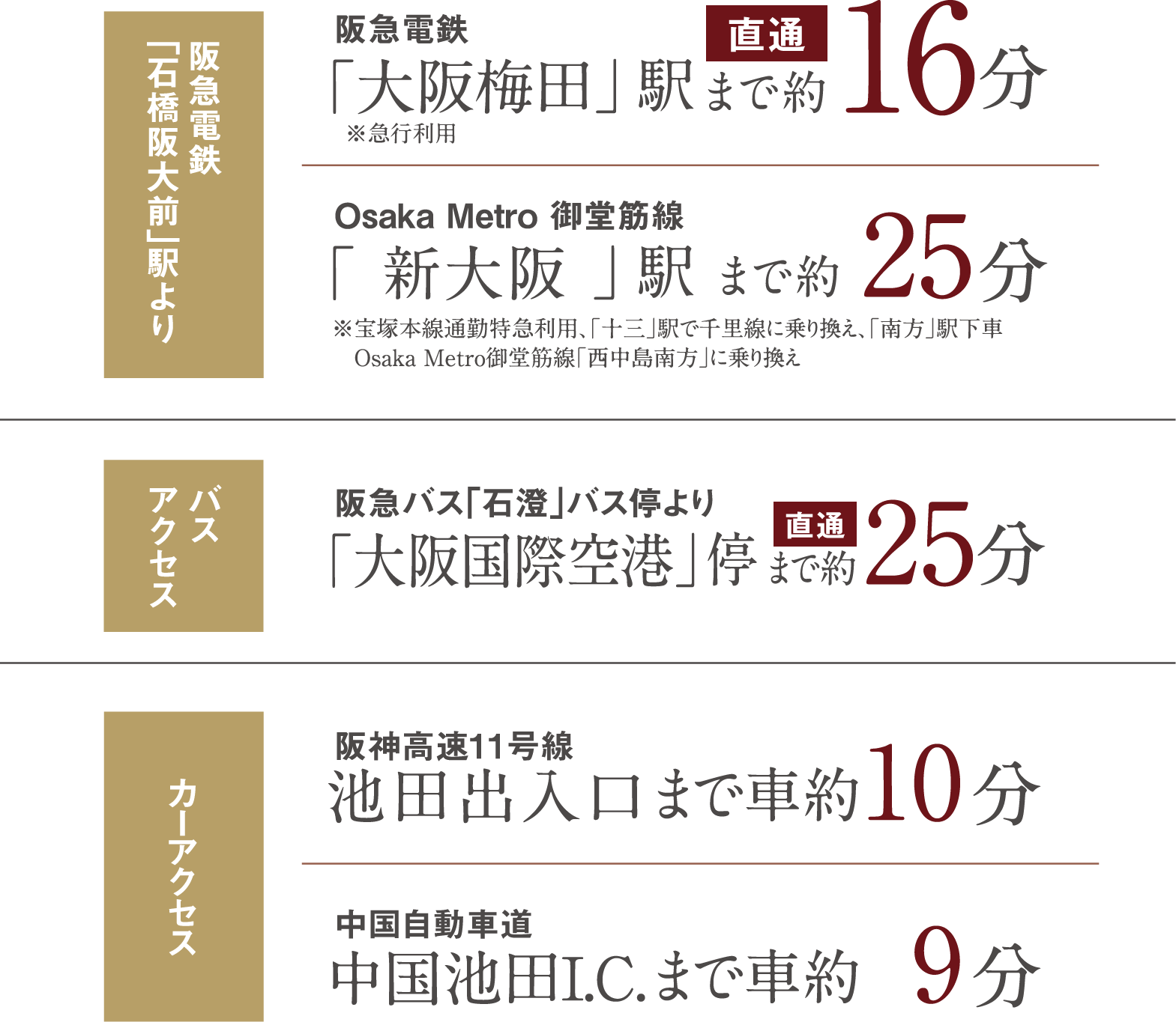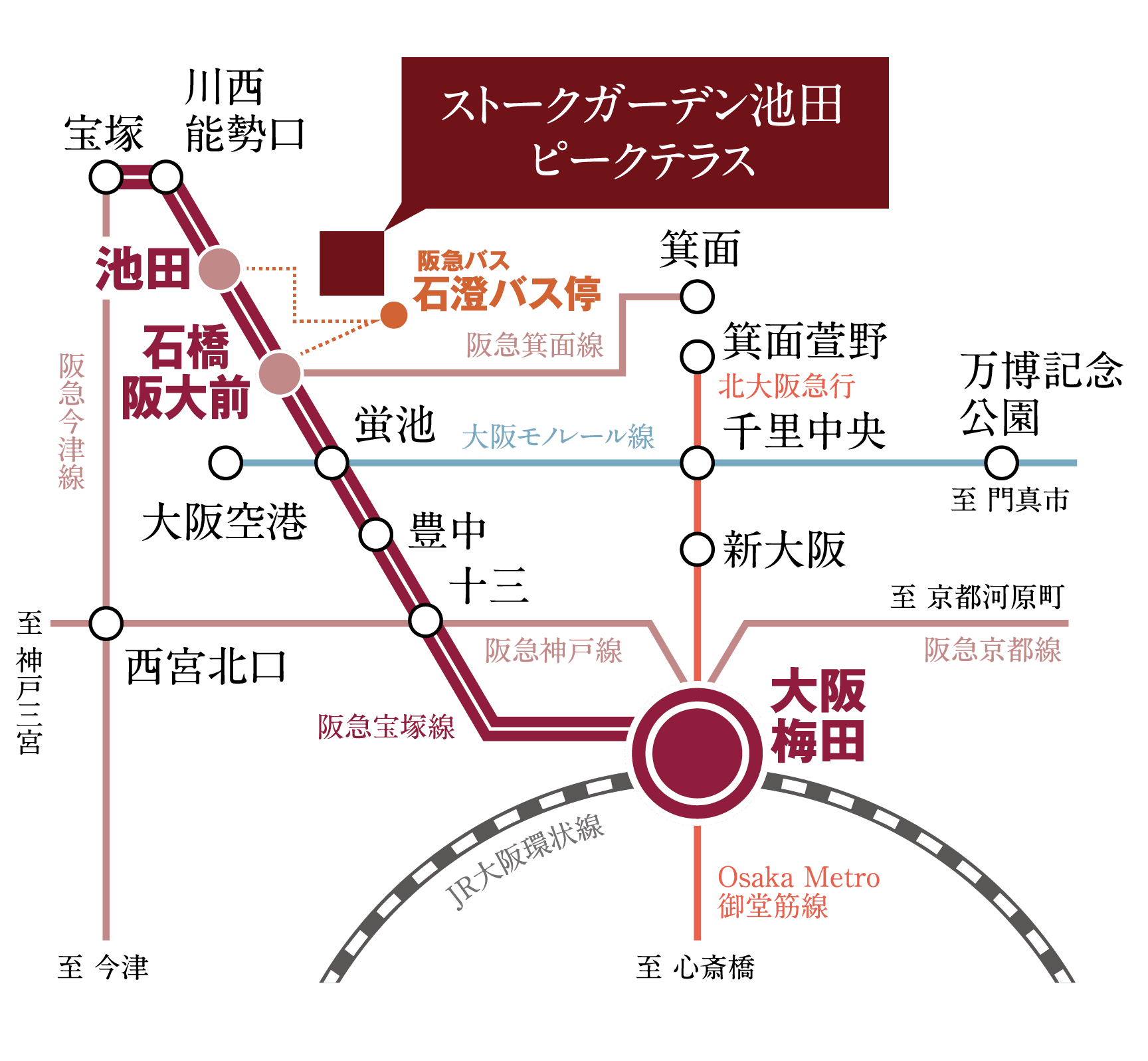 「石橋阪大前」駅から「大阪梅田」駅へ直通約16分、