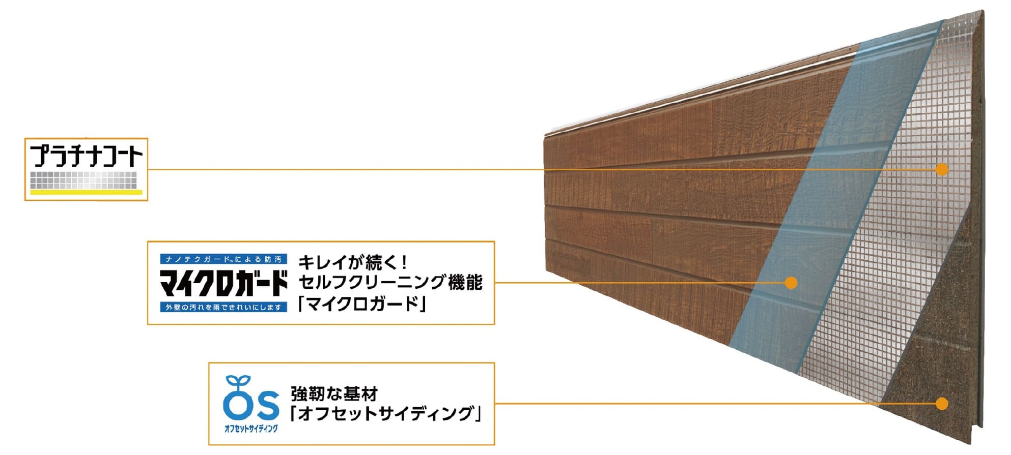 付着した汚れを雨水で繰り返し洗い流す「セルフクリーニング機能」を備えたマイクロガードと、優れた耐候性を発揮するプラチナコートを組み合わせることで、長期にわたり防汚性能を維持。住まいの美しさをしっかり守り続けます。