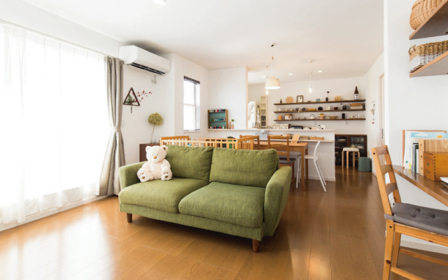 吹き抜けのリビングにはオープン階段。お子様が2階へ上がる様子がキッチンからもよく見えます。