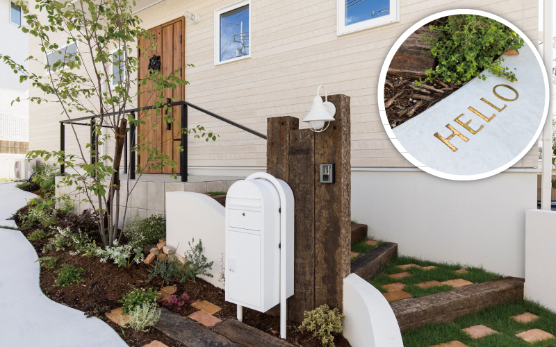 白いポストの前には真鍮(しんちゅう)製の「HELLO」の文字がコンクリートに埋め込まれ、訪れた人をかわいく出迎えてくれます。
