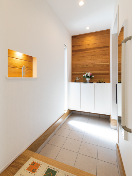 玄関のアクセントにレッドシダーを使い高級感あふれる空間に。