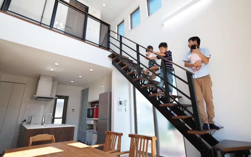 開放的な吹き抜けの下で食卓を囲む、幸せな時間
