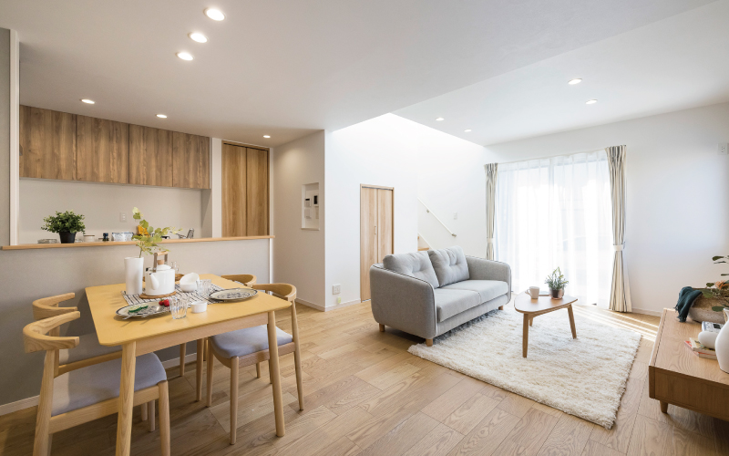 ナチュラルな木の色合いが温かみを感じさせるリビング。家族でゆったりくつろげる空間に。